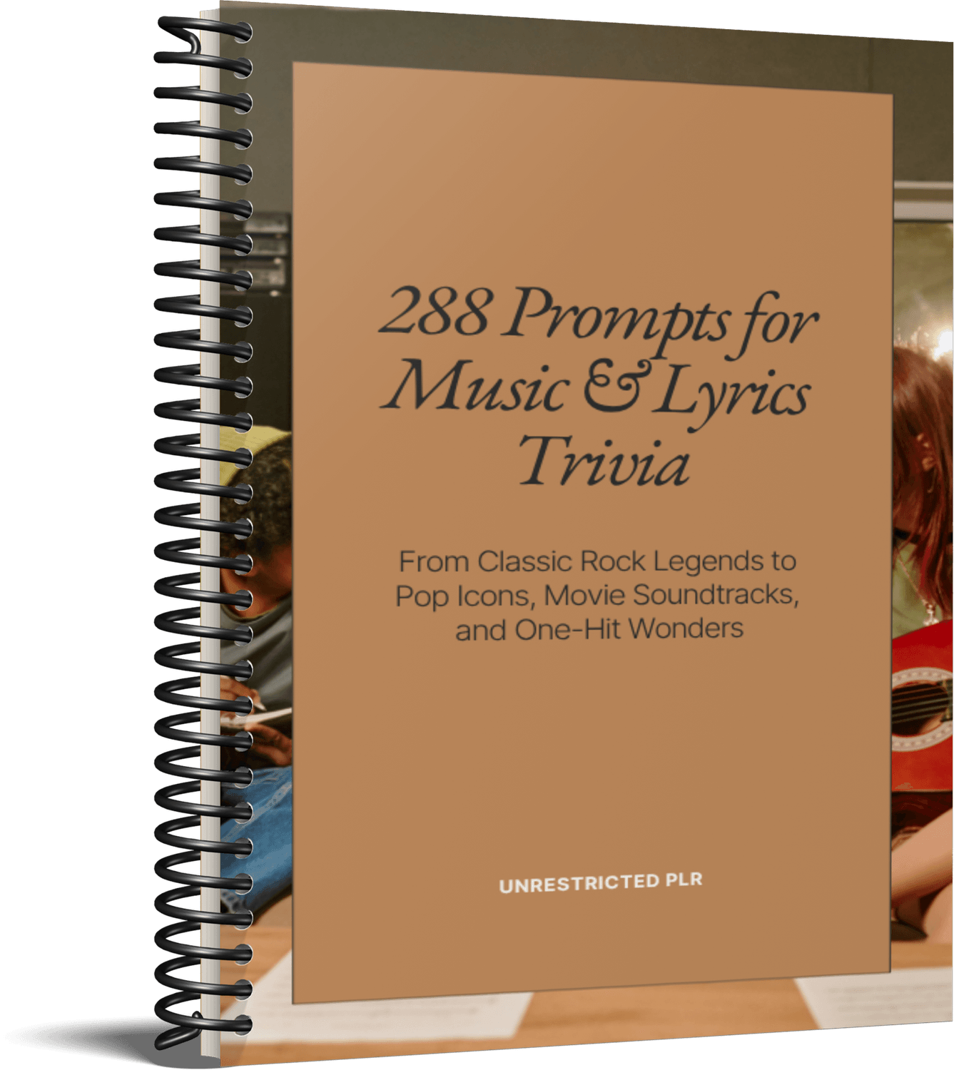 Step into the rhythm of nostalgia, laughter, and lyric-loving fun with 288 Prompts for Music & Lyrics Trivia — your all-in-one, done-for-you collection of story-rich prompts spanning every era and genre.