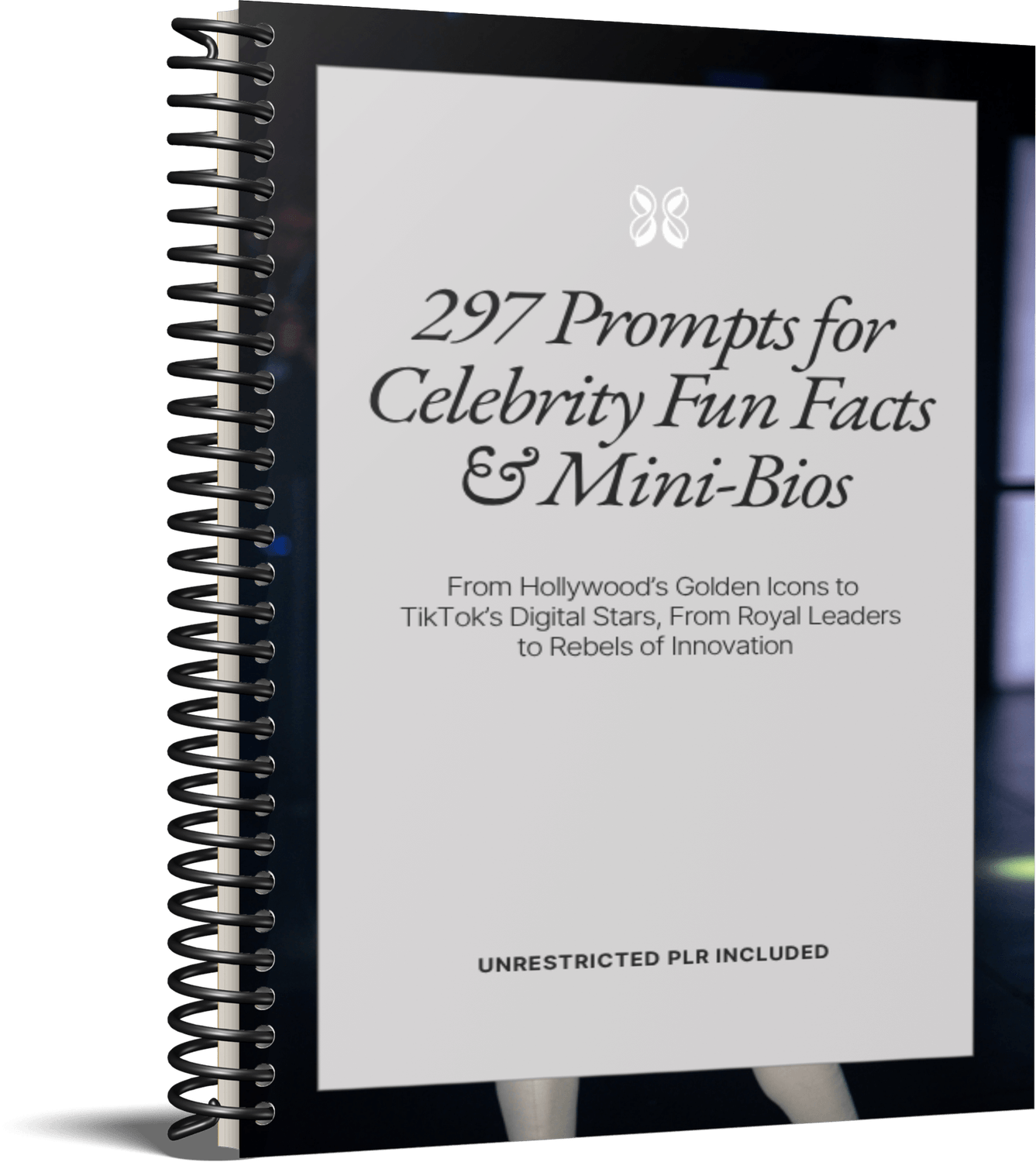 297 Prompts for Celebrity Fun Facts & Mini-Bios celebrates those stories, turning fame into something more human, personal, and inspiring. From Hollywood’s golden icons to TikTok’s digital stars, from royal leaders to rebels of innovation — each prompt captures a slice of life behind the limelight.