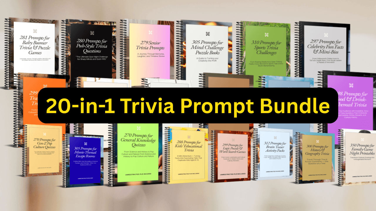 The Ultimate PLR Mega Bundle Library of 20 Done-for-You Entertainment & Trivia Themed Prompt Collections to Build, Brand & Sell Instantly. Perfect Product Bundle Deal for Every Marketer, Publisher, Educator & Content Creator - With Over 6,000+ Ready-to-Use Ideas!