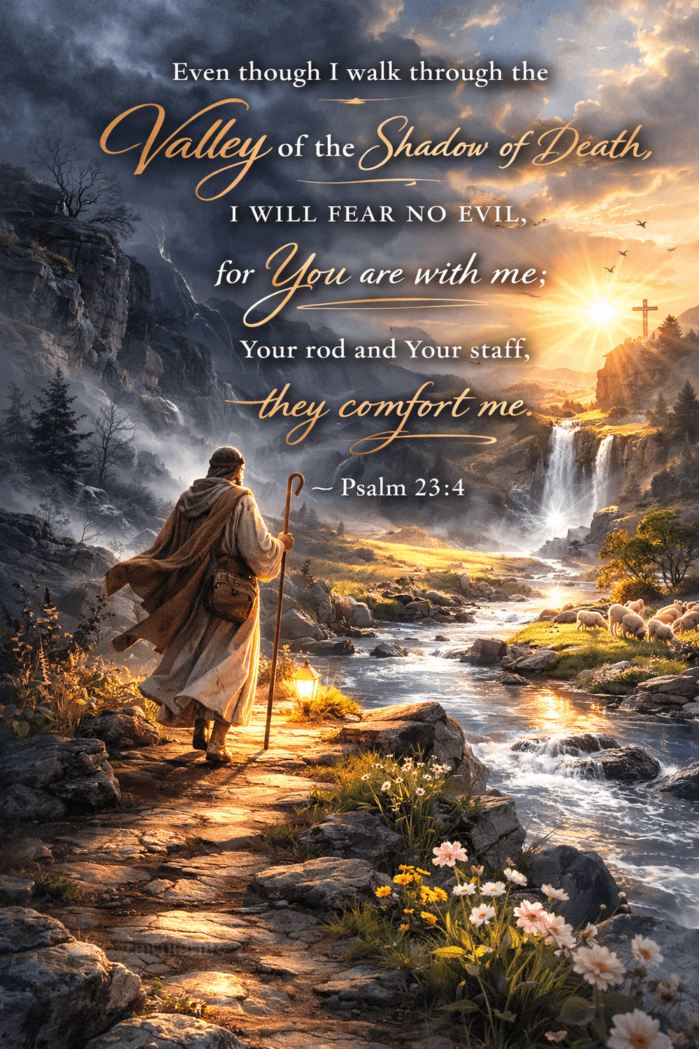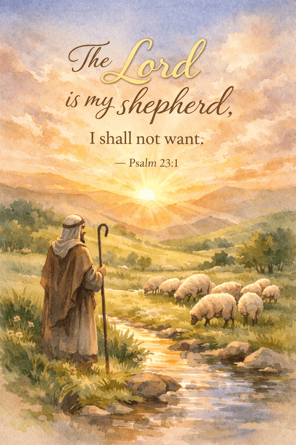 "A peaceful sunrise over rolling green hills with soft golden light breaking through gentle morning clouds. In the foreground, a shepherd stands calmly holding a wooden staff, watching over a small flock of sheep grazing peacefully in lush grass. A quiet stream flows nearby, reflecting the warm sunrise glow. The atmosphere feels serene, safe, and hopeful. Soft watercolor style, warm pastel tones, gentle lighting, high detail, inspirational Christian art, vertical poster format."